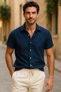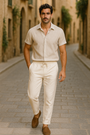 Ingen anledning att koordinera outfits eller överanalysera lager – den här färdiga looken parar en fräsch, kortärmad linneskjorta med lätta byxor med dragsko. Det är modernt, minimalistiskt och designat för att hålla dig sval samtidigt som du ser samlad ut.