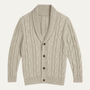 - Egenskaper: Geometriskt kabelstickat mönster, sjalkrag och knäppning fram