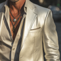 Stick ut utan stressen av att överanalysera din outfit. Monaco Silver Blazer, tillverkad av högkvalitativt PU-läder med metallisk finish, ger en imponerande närvaro som utstrålar självförtroende och stil. Designad med skarpa slag och en skräddarsydd passform, är det den ultimata plagg för män som vill göra intryck oavsett om det är på exklusiva middagar, eleganta fester eller högprofilerade evenemang.